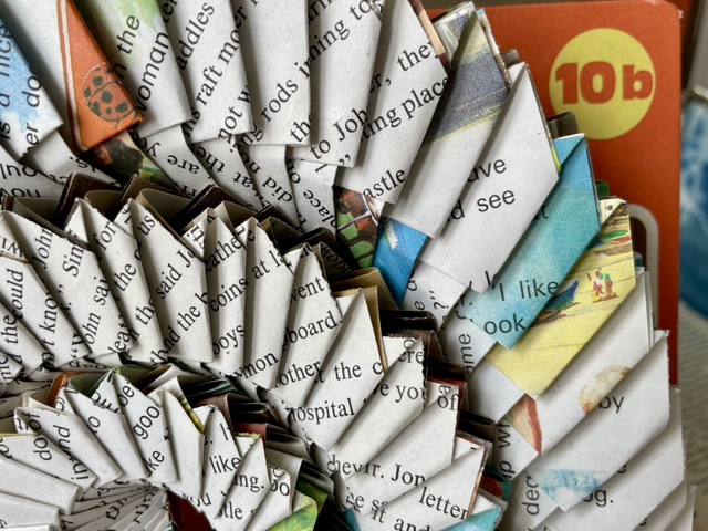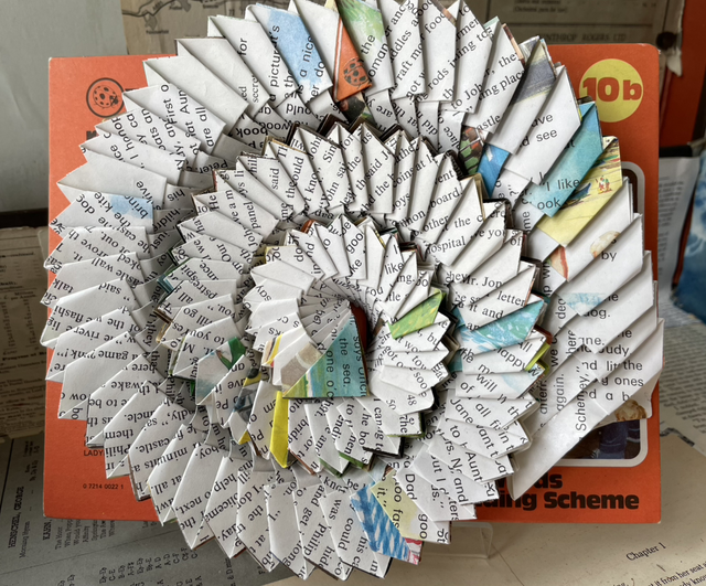 This unique palimpsest is handmade of interlocking pieces of modular origami from the pages of a vintage children’s book and mounted back onto its cover.