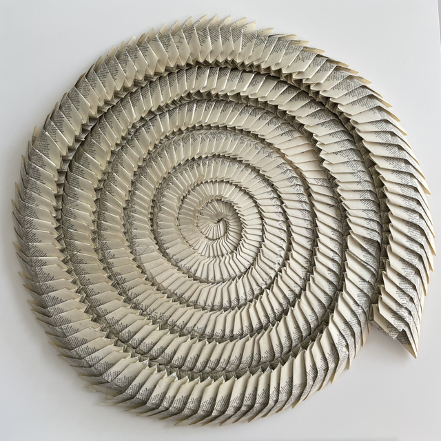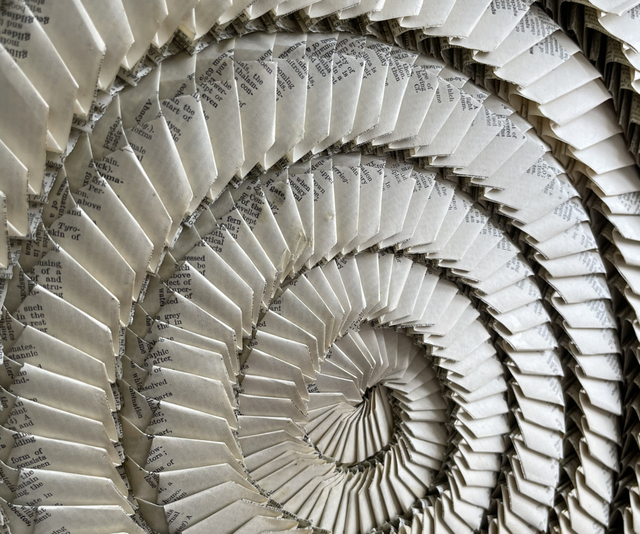 This unique palimpsest is handmade of interlocking pieces of modular origami from the pages of a dictionary and mounted onto a gessoed panel.